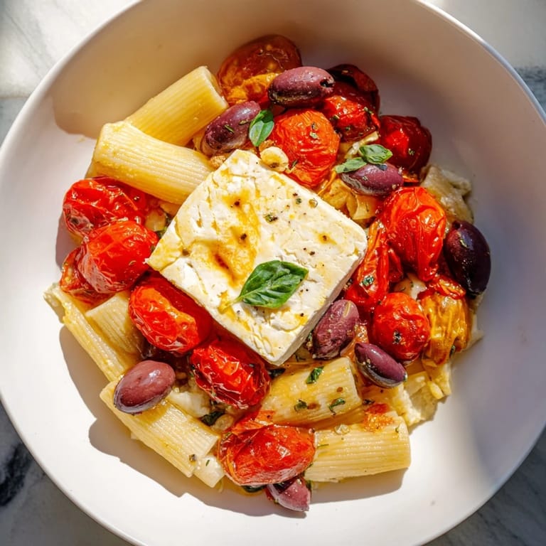 Save A vibrant Mediterranean-inspired pasta dish featuring creamy baked feta, sweet cherry tomatoes, and briny olives, all tossed with al dente pasta for a simple yet irresistible meal.