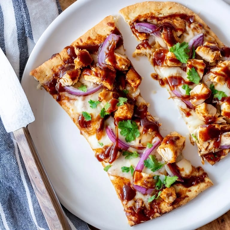 This flatbread shines as a quick weeknight dinner alongside a simple green salad or roasted vegetables. For gatherings, slice it into smaller pieces and serve it warm on a platter with extra BBQ sauce for dipping. It pairs wonderfully with a crisp lager, chilled rosé, or even a tangy lemonade if youre keeping things casual.