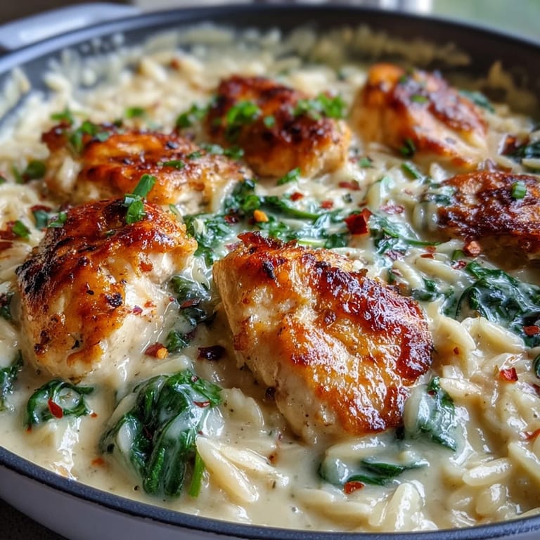This is a complete meal on its own, honestly—the orzo acts as both protein vessel and starch, and the spinach covers your green vegetable requirement. But if you want to round it out, a simple green salad with acidic vinaigrette cuts through the richness and makes your palate feel refreshed between bites. A crisp white wine like Chardonnay or Pinot Grigio sits alongside it beautifully, and crusty bread appears on tables for a reason—to capture the last creamy bits from the bowl.
