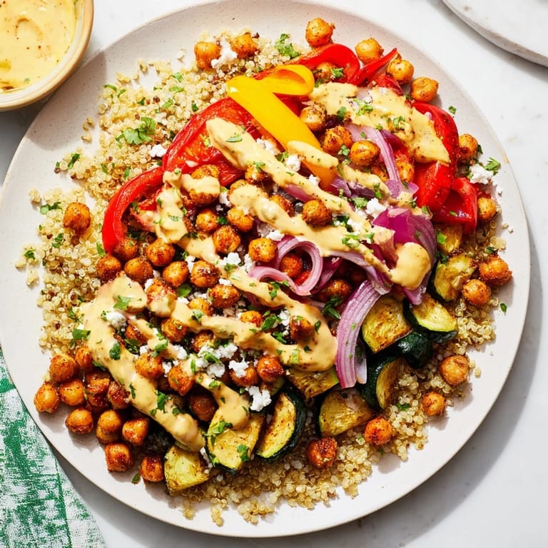 Save A vibrant, wholesome grain bowl featuring roasted vegetables, chickpeas, and a tangy lemon-tahini dressing—perfect for a satisfying lunch or light dinner.