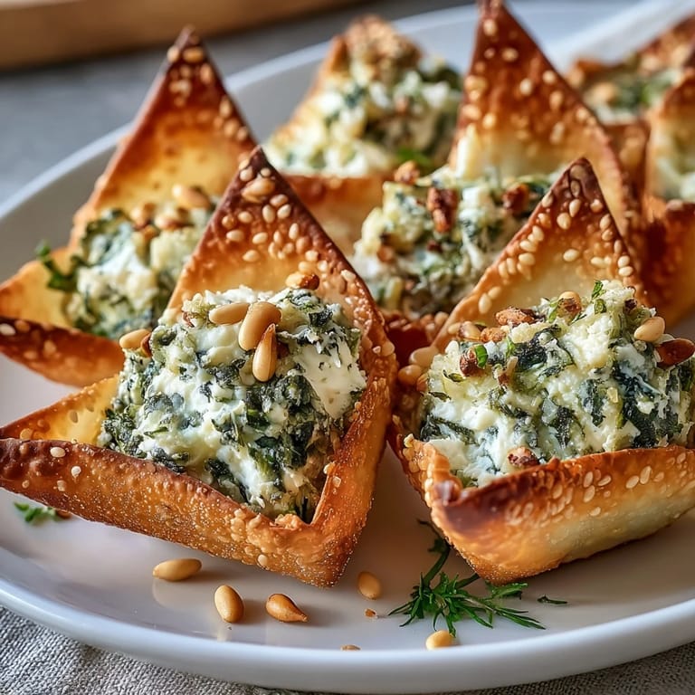 Save My neighbor handed me a tray of these at a backyard gathering, and I stood there eating five before I even realized I'd left the conversation. The combination of crisp golden wonton and that tangy feta-spinach filling was so unexpectedly satisfying that I asked for the recipe on the spot. She laughed and said they were her emergency appetizer, the kind you make when you need to impress without spending an hour in the kitchen. I've been making them ever since, tweaking the herbs and adding a little lemon zest to brighten everything up.